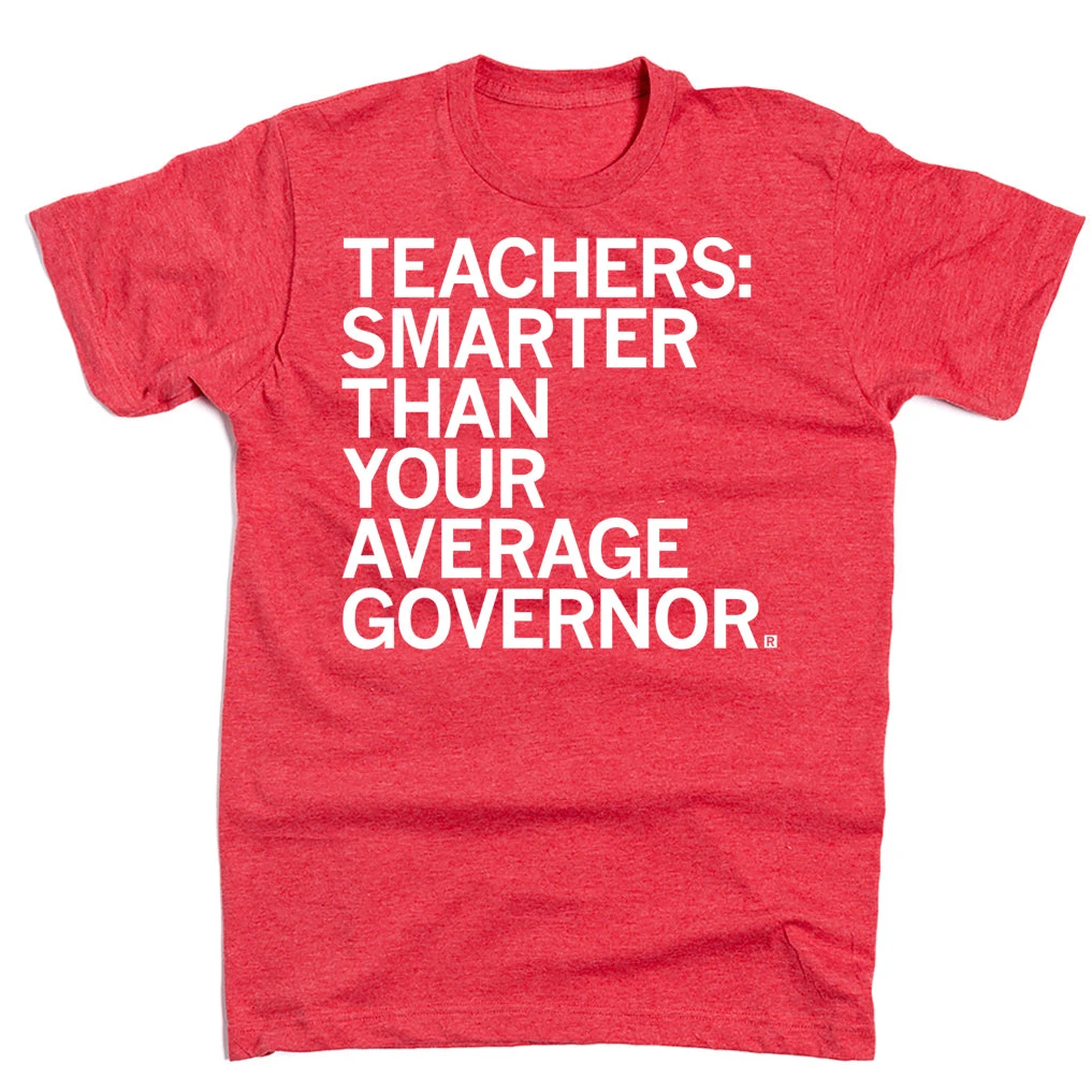 Teachers: Smarter Than your Average Governor. A Portion of All RAYGUN Sales Raise Money For Organizations That We Support. White Screen Print on a Heather Red T-shirt (50% Combed Ringspun Cotton / 50% Polyester). Cut & sewn sweatshop free. Designed and Printed by Union Labor at RAYGUN.