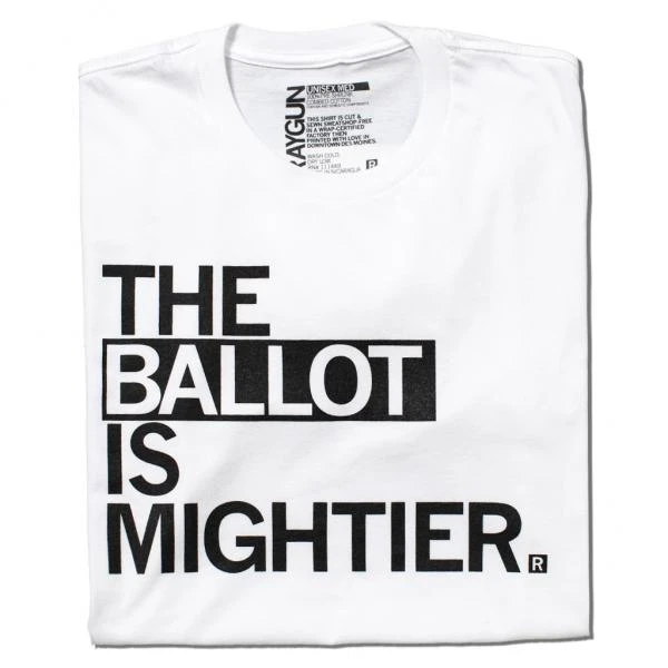 The Ballot Is Mightier. This Design Has Been Retired and is No Longer Available on Our Sales Floors But Can Be Ordered Here Online! Since All of Our Retired Designs Are Printed on Demand, Please Allow For a Couple Extra Days Before Shipping. A portion of sales goes to supporting year-round political engagement and the importance of voting. Black Screen Print on a White T-shirt (100% Combed Ringspun Cotton). Cut and sewn sweatshop free. Designed and printed by Union Labor at RAYGUN.