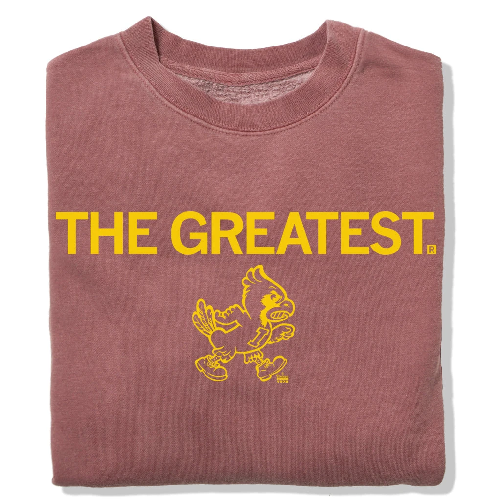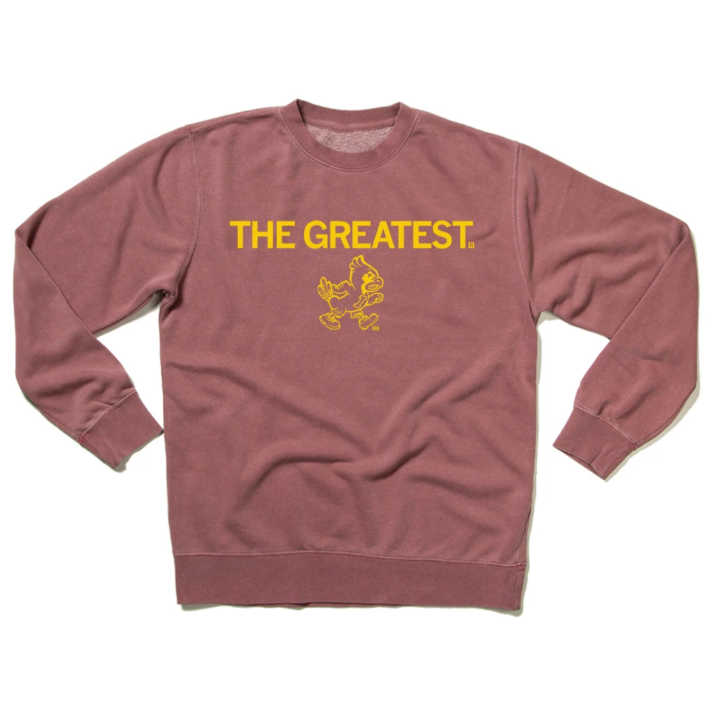 The Greatest Cy In The Universe. A Portion of All RAYGUN Sales Raise Money For Organizations That We Support. Gold screen print on pigment maroon crew sweatshirt (80% Combed and Ringspun Cotton / 20% Polyester). Cut and sewn sweatshop free. Designed and printed by Union Labor at RAYGUN.