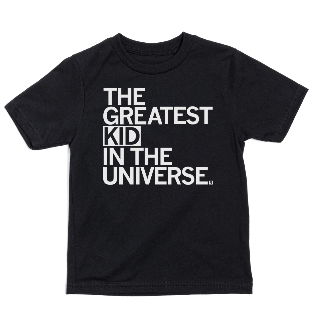 The Greatest Kid In The Universe. White Screen Print on Black T-Shirt (100% Combed Ring-spun Cotton). Cut and sewn sweatshop free. Designed and printed by Union Labor at RAYGUN.