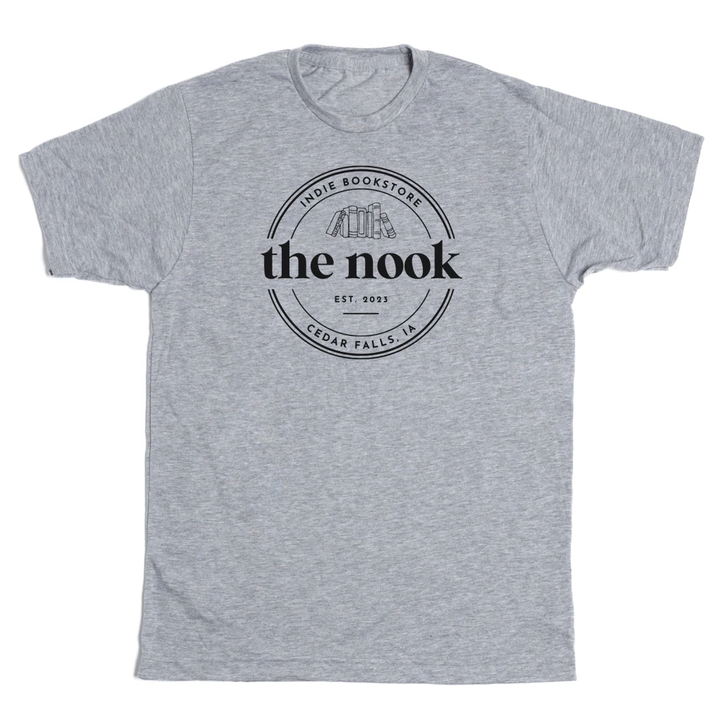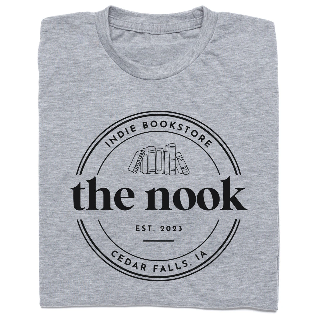 The Nook Indie Bookstore Cedar Falls, Iowa. A Portion of All RAYGUN Sales Raise Money For Organizations That We Support. Black Screen Print on a Heather Grey T-shirt (65% Polyester / 35% Combed Ringspun Cotton). Cut & sewn sweatshop free. Designed and Printed by Union Labor at RAYGUN.