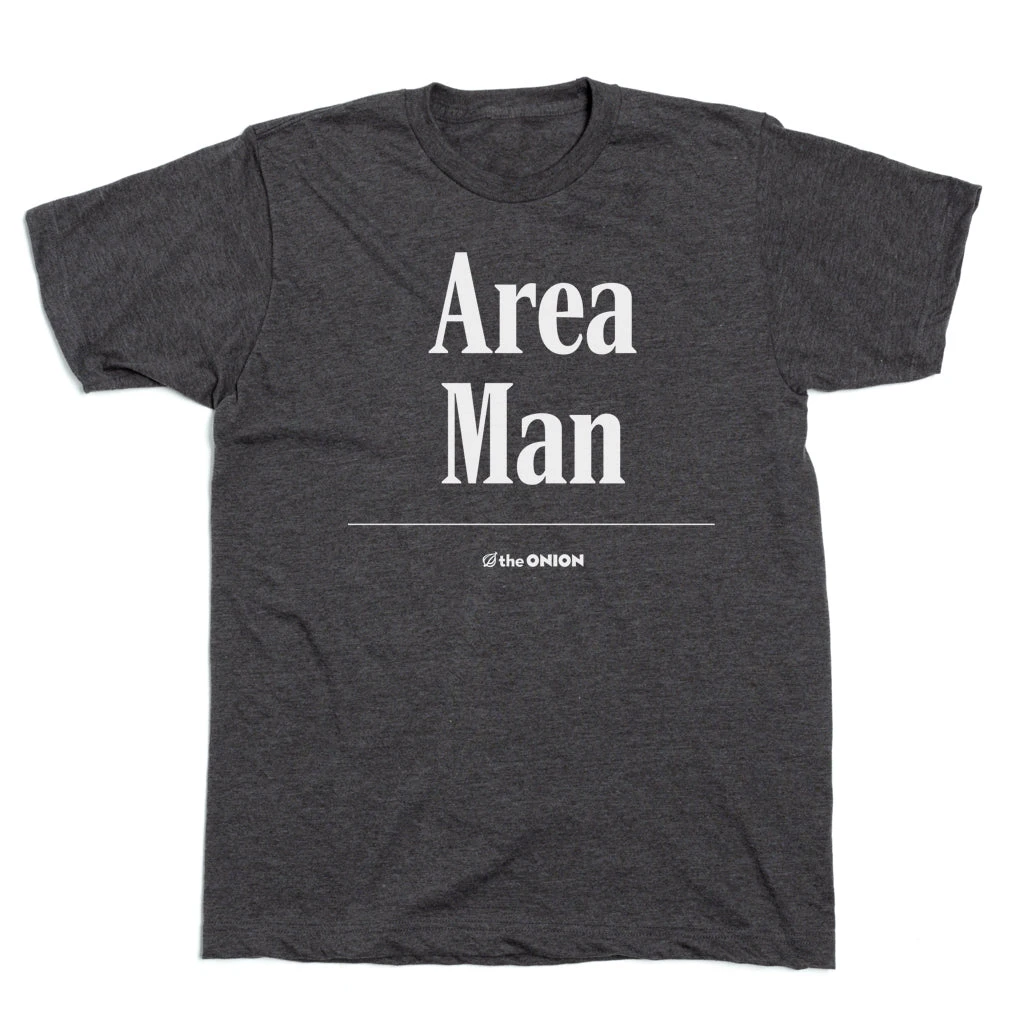 The Onion: Area Man. RAYGUN & The Onion have collaborated on never-before-made Onion product for a limited time. A Portion of All RAYGUN Sales Raise Money For Organizations That We Support. White Screen Print on a Charcoal T-shirt (50% Combed Ringspun Cotton / 50% Polyester). Cut and sewn sweatshop free. Designed and printed by Union Labor at RAYGUN.