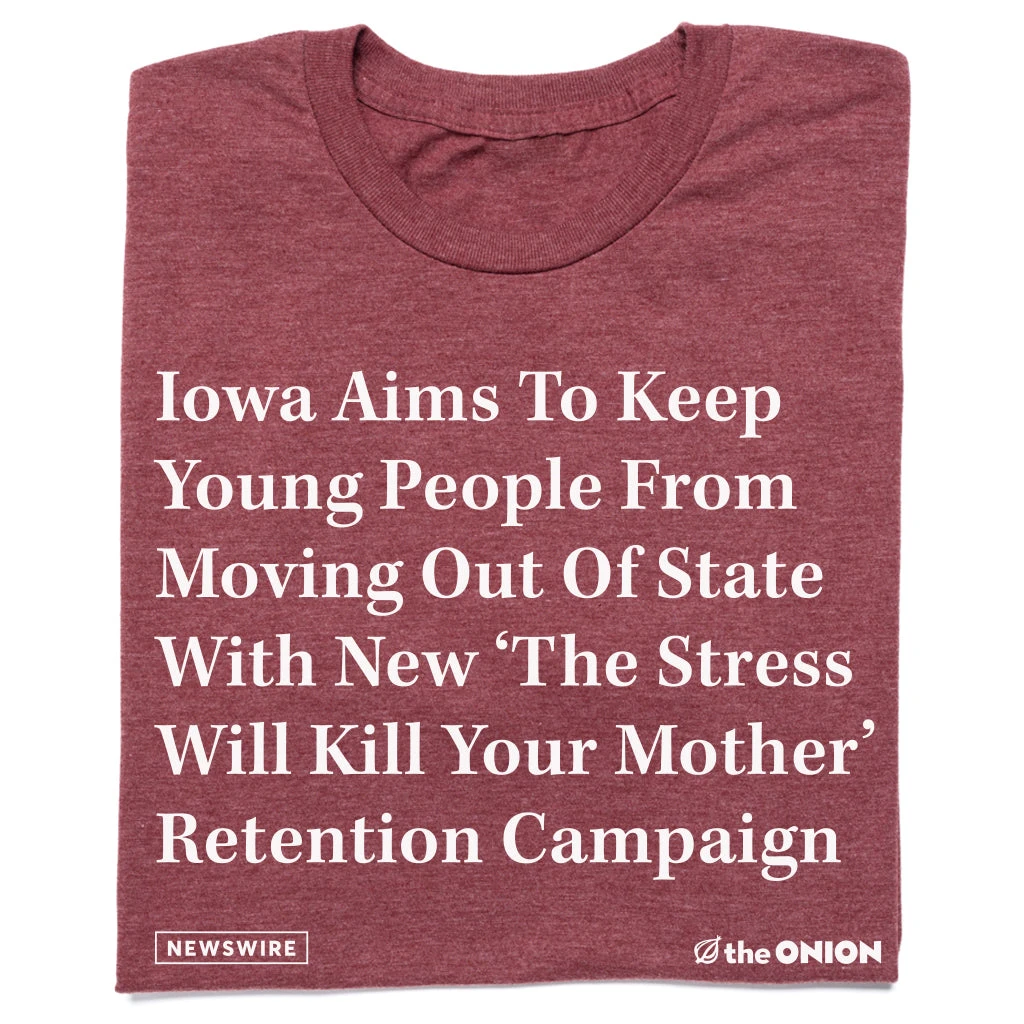 The Onion: Iowa aims to keep young people from moving out of state with new ‘The Stress Will Kill Your Mother’ retention campaign. RAYGUN & The Onion have collaborated on never-before-made Onion product for a limited time. A Portion of All RAYGUN Sales Raise Money For Organizations That We Support. White Screen Print on a Heather Burgundy T-shirt (50% Combed Ringspun Cotton / 50% Polyester). Cut and sewn sweatshop free. Designed and printed by Union Labor at RAYGUN.