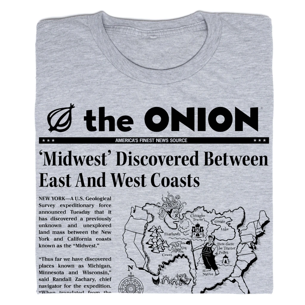 The Onion: Midwest Discovered! RAYGUN & The Onion have collaboratiedon never-before-made Onion product for a limited time. A Portion of All RAYGUN Sales Raise Money For Organizations That We Support. Black Screen Print on a Heather Grey T-shirt (65% Polyester / 35% Combed Ringspun Cotton). Cut and sewn sweatshop free. Designed and printed by Union Labor at RAYGUN.
