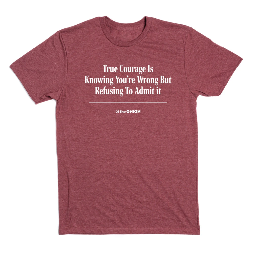 The Onion: True courage is knowing you’re wrong but refusing to admit it. RAYGUN & The Onion have collaboratiedon never-before-made Onion product for a limited time. A Portion of All RAYGUN Sales Raise Money For Organizations That We Support. White Screen Print on a Heather Burgundy T-shirt (50% Combed Ringspun Cotton / 50% Polyester). Cut and sewn sweatshop free. Designed and printed by Union Labor at RAYGUN.