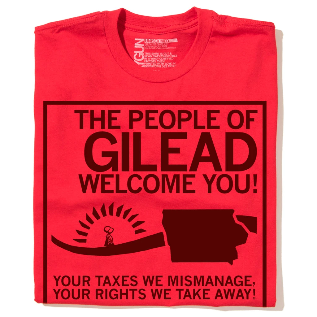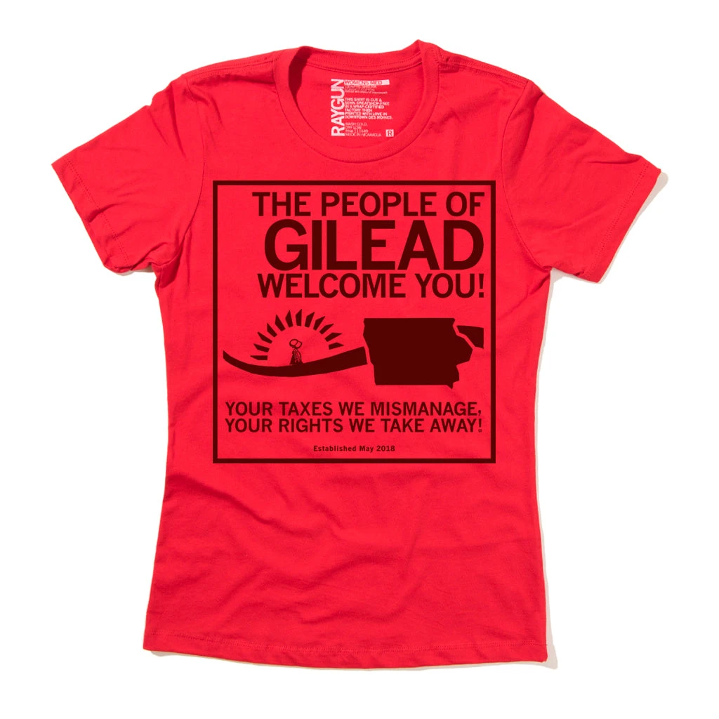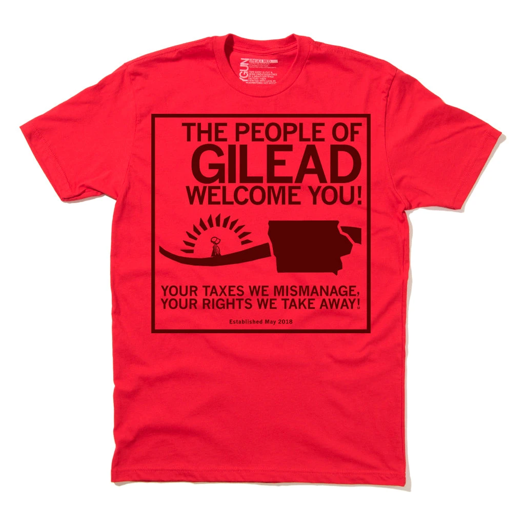 The People Of Gilead Welcome You! Your Taxes We Mismanage, Your Rights We Take Away! Some proceeds go to the Iowa Abortion Access Fund and to Planned Parenthood North Central States. Since we print this design on demand, please allow up to two weeks for delivery. Maroon Screen Print on a Red T-shirt (100% Combed Ringspun Cotton). Cut and sewn sweatshop free. Designed and printed by Union Labor at RAYGUN.