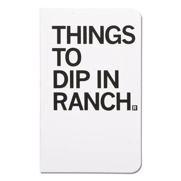 Things To Dip In Ranch. Black Screen Print on Unlined paper made in the USA. Dimensions: 5.5″ x 8.5″ Designed by RAYGUN. Printed by Union Labor at RAYGUN. Assembled using union labor at Garner Printing in Des Moines, IA