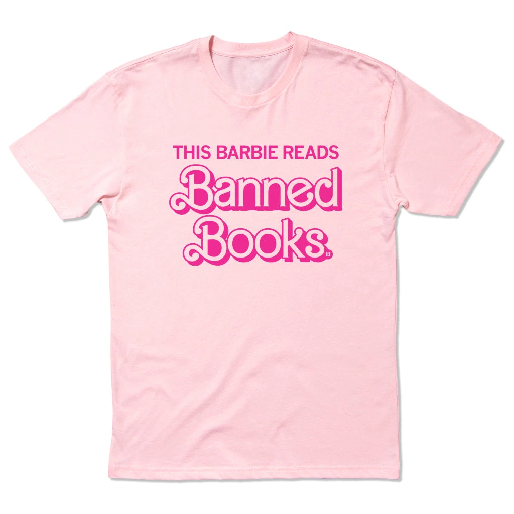 This Barbie Reads Banned Books. A Portion of All RAYGUN Sales Raise Money For Organizations That We Support. Rhodamine Pink Screen Print on a Light Pink T-shirt (100% Combed Ringspun Cotton). Cut & sewn sweatshop free. Designed and Printed by Union Labor at RAYGUN.