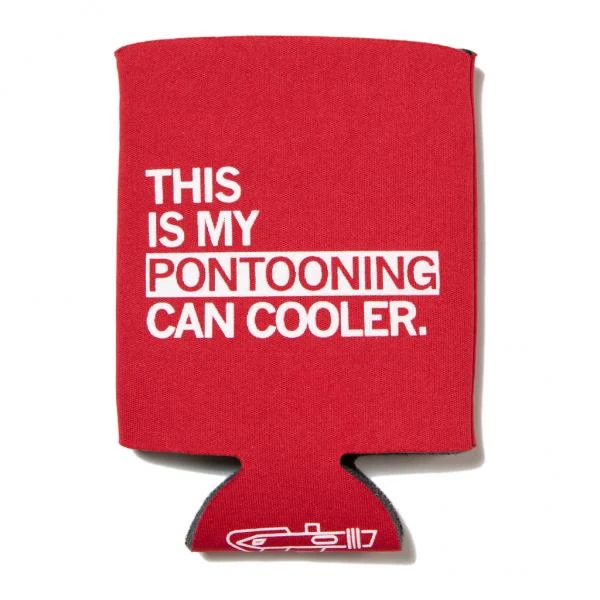 This Is My Pontooning Can Cooler. White plastisol ink print on red fade-resistant polyester covered scuba foam. Designed by RAYGUN. Imported and printed in the USA.
