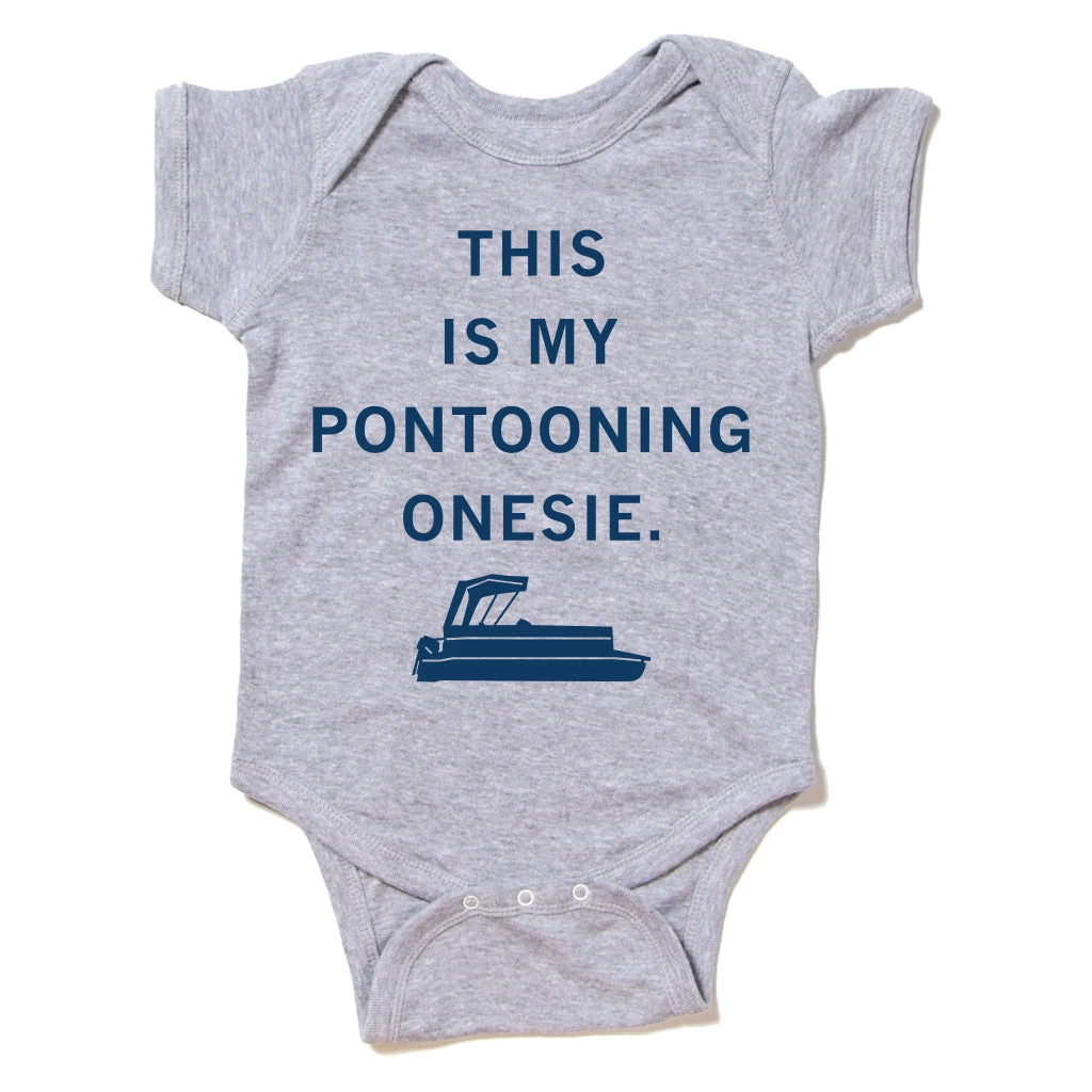 This Is My Pontooning Onesie. A Portion of All RAYGUN Sales Raise Money For Organizations That We Support. Light Navy Screen Print on a Heather Grey Onesie (90% Baby Rib Cotton / 10% Polyester). Item will shrink an average of one size when put in the dryer. Cut and sewn sweatshop free. Designed and printed by Union Labor at RAYGUN.