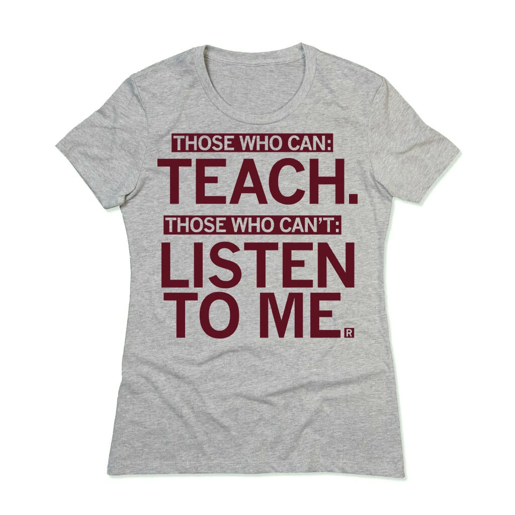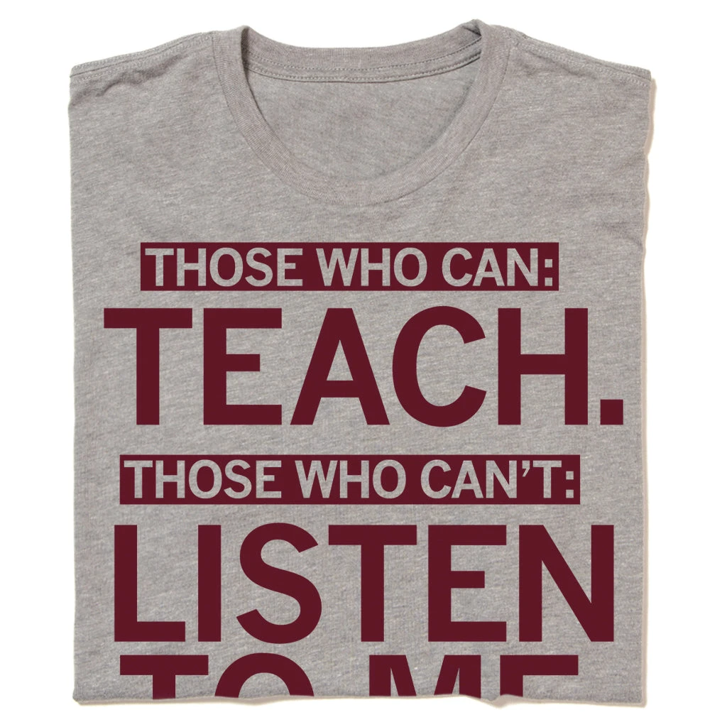 Those Who Can: Teach. Those Who Can’t: Listen To Me. A Portion of All RAYGUN Sales Raise Money For Organizations That We Support. Maroon Screen Print on a Heather Grey T-shirt (65% Polyester / 35% Combed Ringspun Cotton) Cut & sewn sweatshop free. Designed and Printed by Union Labor at RAYGUN