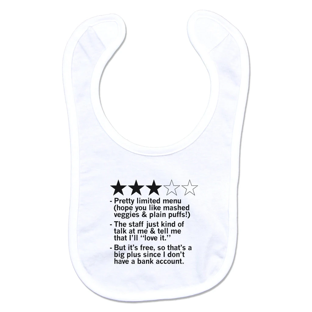 Three Stars: pretty limited menu. A Portion of All RAYGUN Sales Raise Money For Organizations That We Support. Black Screen Print on a White Bib (100% Baby Rib Cotton). Cut and sewn sweatshop free. Designed and printed by Union Labor at RAYGUN.