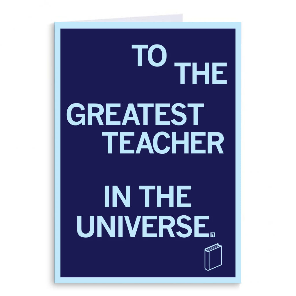 To The Greatest Teacher In The Universe. A Portion of All RAYGUN Sales Raise Money For Organizations That We Support. 5″ x 7″ Folded Greeting Card. Inside of the card is blank and envelope included. Designed by RAYGUN and printed by union labor at Garner Printing in Des Moines, IA.