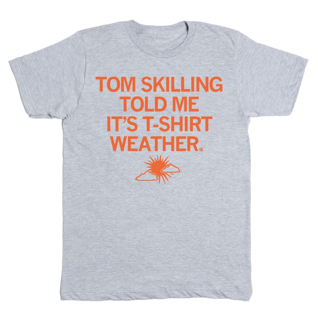 Tom Skilling told me it’s T-Shirt Weather. This Design Has Been Retired and is No Longer Available on Our Sales Floors But Can Be Ordered Here Online! Since All of Our Retired Designs Are Printed on Demand, Please Allow For a Couple Extra Days Before Shipping. A Portion of All Raygun Sales Raise Money For Organizations That We Support. Orange Screen Print on a Light Grey T-shirt (90% Combed Ringspun Cotton / 10% Polyester). Cut and sewn sweatshop free. Designed and printed by Union Labor at RAYGUN.