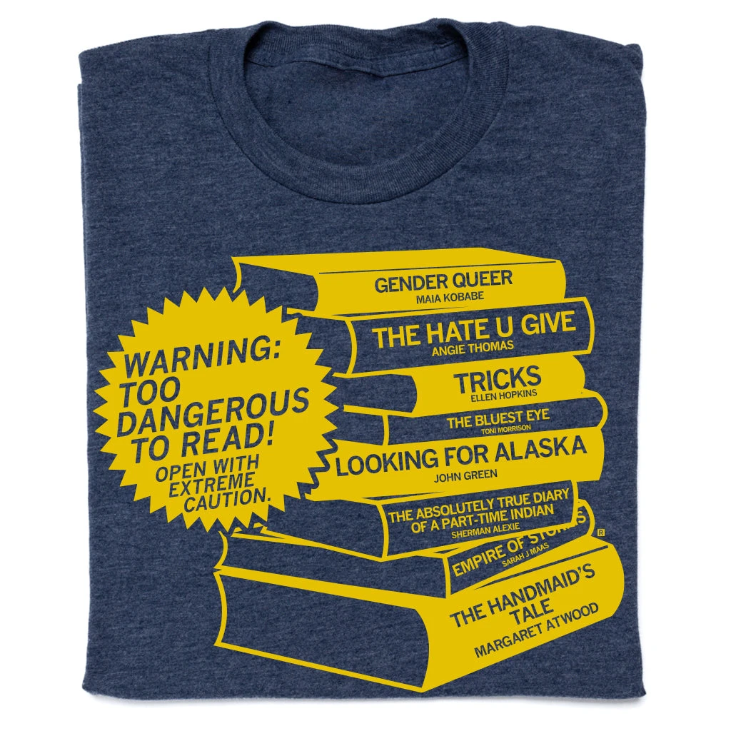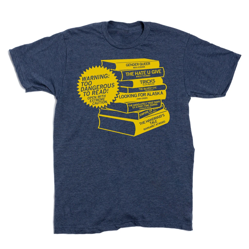 Warning: These Books Are Too Dangerous To Read! A Portion of All RAYGUN Sales Raise Money For Organizations That We Support. Gold Screen Print on a Heather Denim T-shirt (50% Combed Ringspun Cotton / 50% Polyester). Cut & sewn sweatshop free. Designed and Printed by Union Labor at RAYGUN.
