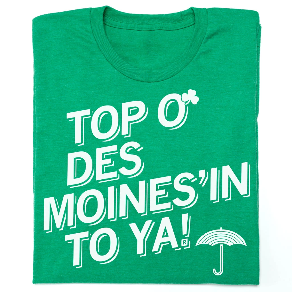 Top O’ Des Moines’In To Ya. A Portion of All Raygun Sales Raise Money For Organizations That We Support. White Screen Print on a Heather Kelly Green T-Shirt (50% Combed Ringspun Cotton / 50% Polyester). Cut and sewn sweatshop free. Designed and printed by Union Labor at RAYGUN.