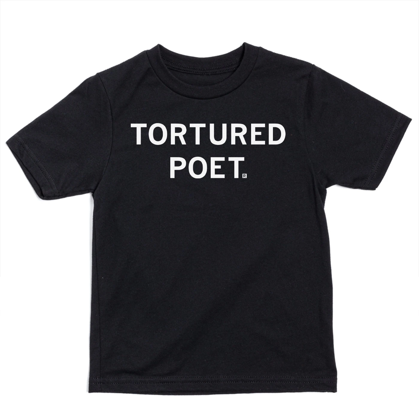Tortured poet. A Portion of All RAYGUN Sales Raise Money For Organizations That We Support. White Screen Print on a Black T-Shirt (100% Combed Ringspun Cotton). Cut and sewn sweatshop free. Designed and printed by Union Labor at RAYGUN.