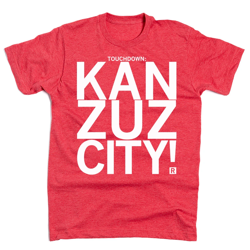 Touchdown KAN ZUZ CITY! A Portion of All Raygun Sales Raise Money For Organizations That We Support. White Screen Print on a Heather Red T-shirt (50% Combed Ringspun Cotton / 50% Polyester). Cut and sewn sweatshop free. Designed and printed by Union Labor at RAYGUN.
