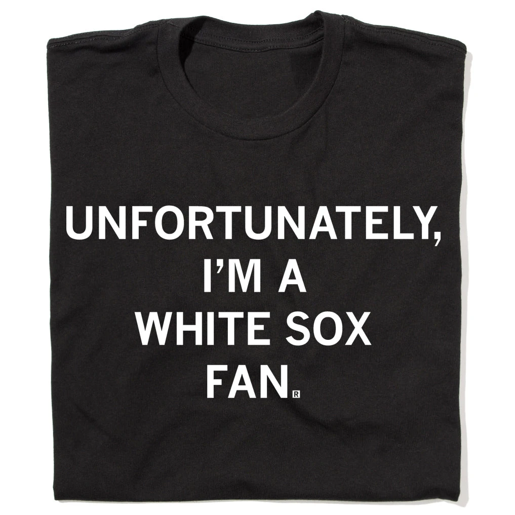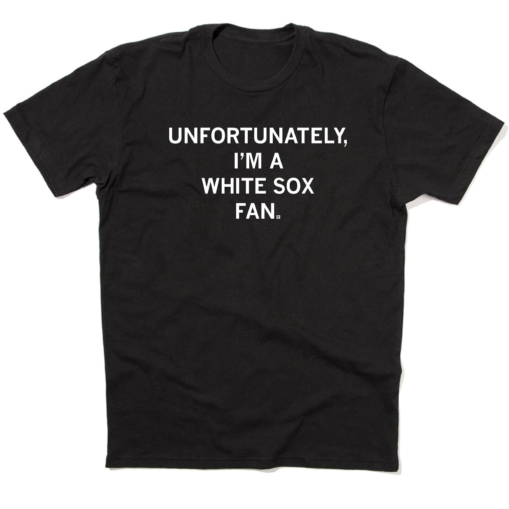 Unfortunately, I’m A White Sox Fan. A Portion of All RAYGUN Sales Raise Money For Organizations That We Support. White Screen Print on a Black T-shirt (100% Combed Ringspun Cotton). Cut & sewn sweatshop free. Designed and Printed by Union Labor at RAYGUN.