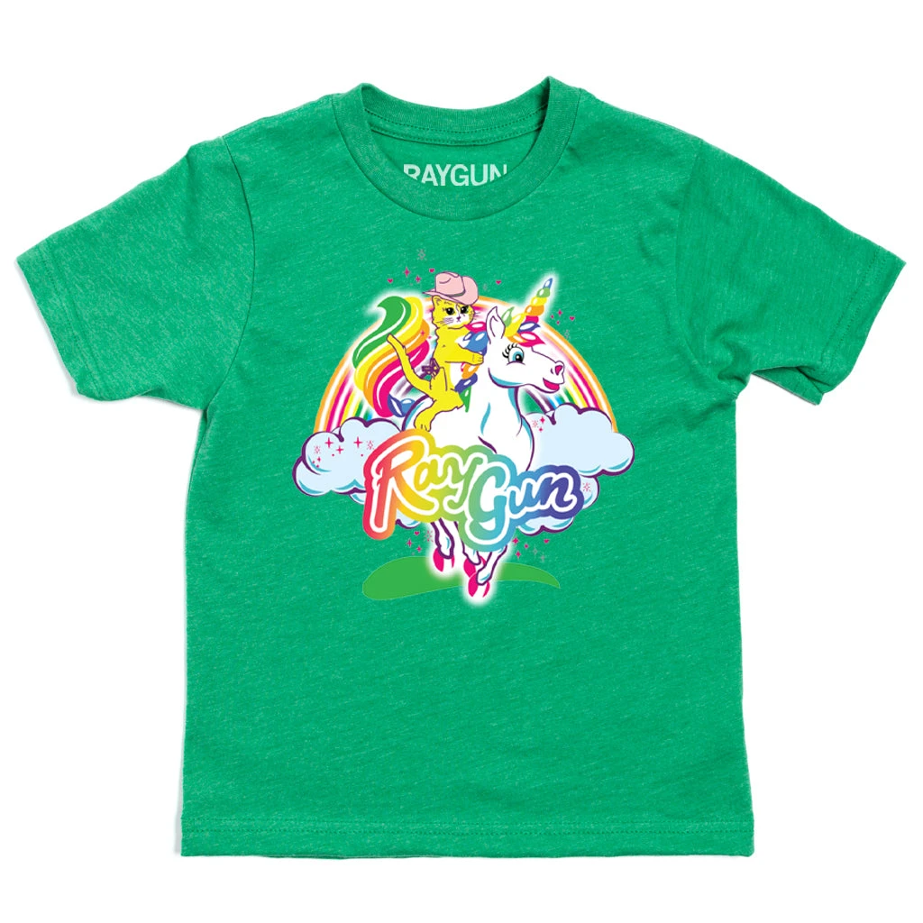 Happy Pride from RAYGUN. 2T & 4T sizes are a Heat Transfer on a Kelly Green T-shirt (100% Combed Ringspun Cotton) while 5T (YXS) and above are on a Heather Kelly Green T-shirt (60% Combed Ringspun Cotton / 40% Polyester) Cut and sewn sweatshop free. Designed and printed by Union Labor at RAYGUN.