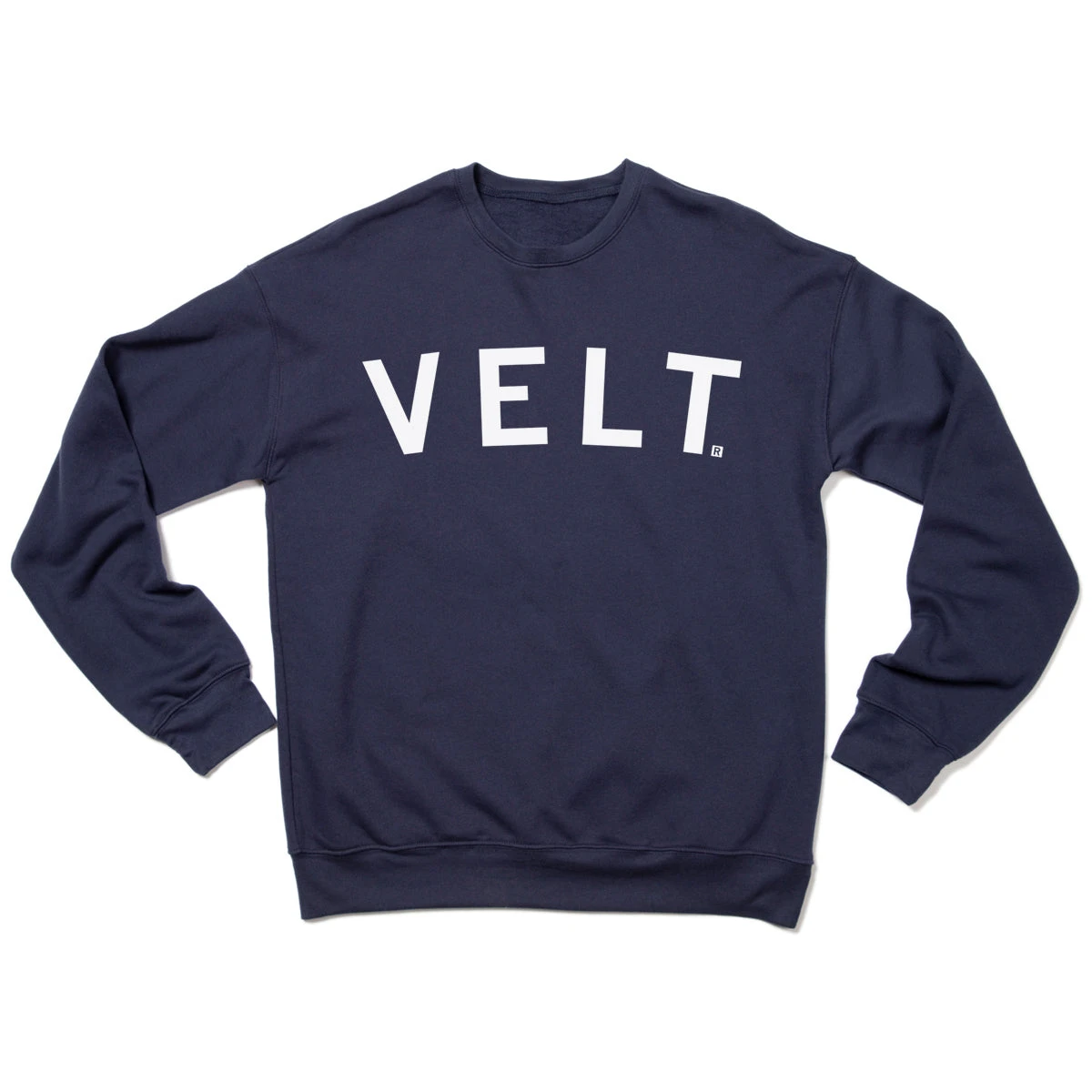 Velt. A Portion of All RAYGUN Sales Raise Money For Organizations That We Support. White Screen Print on a Heather Navy Crew Sweatshirt (80% Combed Ringspun Cotton / 20% Polyester). Cut & sewn sweatshop free. Designed and Printed by Union Labor at RAYGUN.