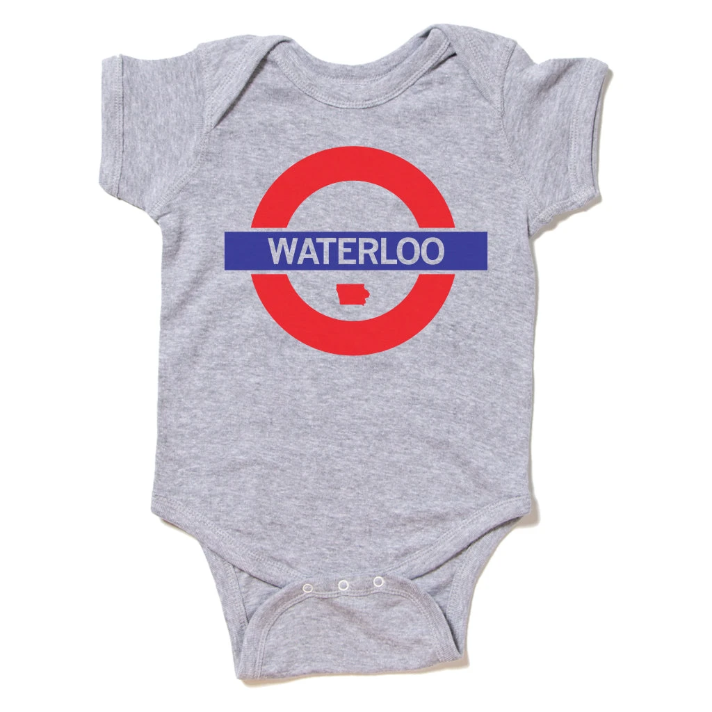 Waterloo Station. A Portion of All RAYGUN Sales Raise Money For Organizations That We Support. Bright Red & Royal Blue Screen Print on a Heather Grey Onesie (90% Baby Rib Cotton / 10% Polyester). Item will shrink an average of one size when put in the dryer. Cut and sewn sweatshop free. Designed and printed by Union Labor at RAYGUN.