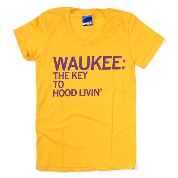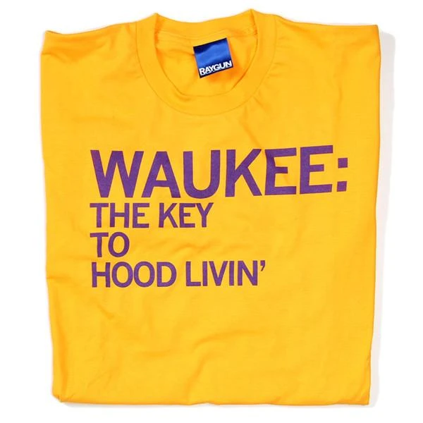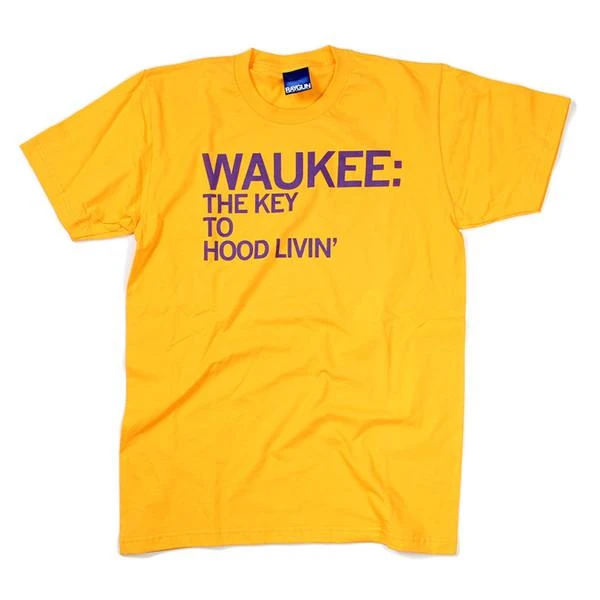 Waukee: The Key To Hood Living. This Design Has Been Retired and is No Longer Available on Our Sales Floors But Can Be Ordered Here Online! Since All of Our Retired Designs Are Printed on Demand, Please Allow For a Couple Extra Days Before Shipping. A Portion of All Raygun Sales Raise Money For Organizations That We Support. Purple Screen Print on a Gold T-shirt (100% Combed Ringspun Cotton) Cut & sewn sweatshop free. Designed and Printed by Union Labor at RAYGUN