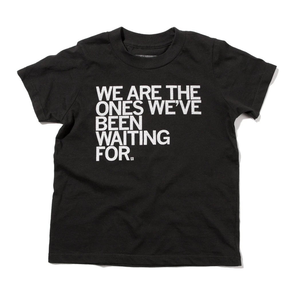 We Are The Ones We’ve Been Waiting For. A portion of the proceeds for this design will be donated to organizing efforts in KC, DM, and Eastern Iowa. White Screen Print on a Black T-Shirt (100% Combed Ring-spun Cotton). Cut and sewn sweatshop free. Designed and printed by Union Labor at RAYGUN.