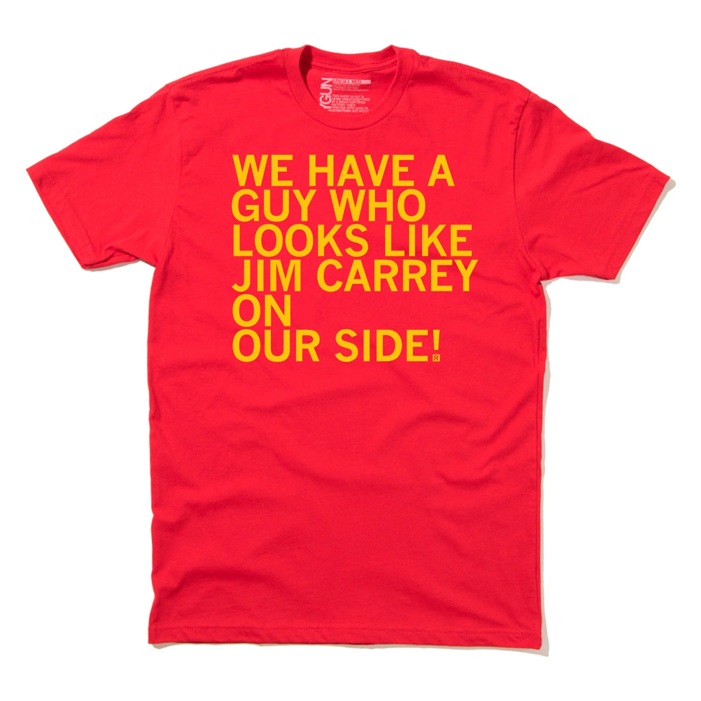 We have a guy who looks like Jim Carrey. Approved by Cyclone Jim Carrey with a portion of sales benefiting the We Will Collective. A Portion of All RAYGUN Sales Raise Money For Organizations That We Support. Gold Screen Print on a Red T-shirt (100% Combed Ringspun Cotton). Cut & sewn sweatshop free. Designed and Printed by Union Labor at RAYGUN.