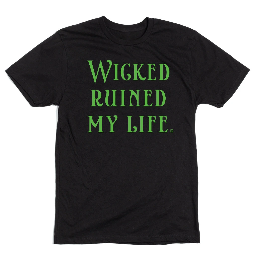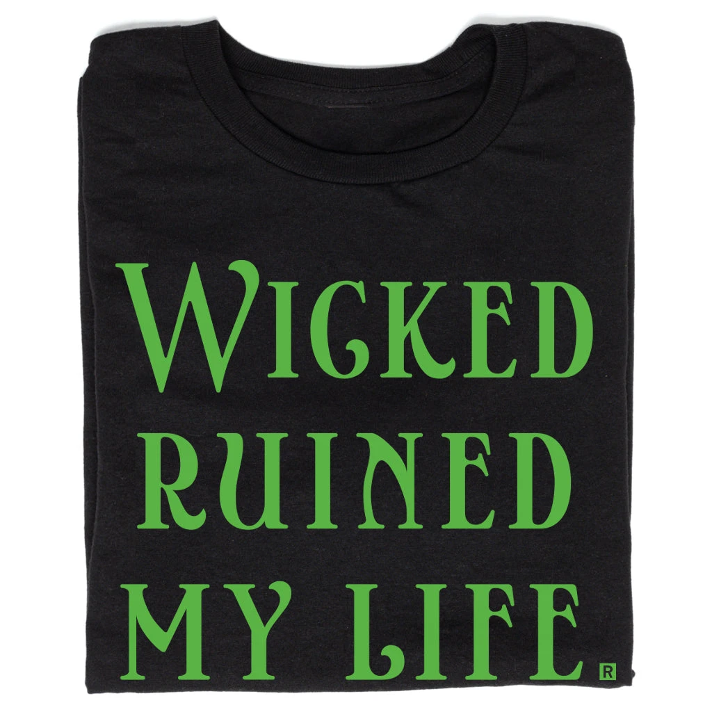 Wicked ruined my life. A Portion of All RAYGUN Sales Raise Money For Organizations That We Support. Traffic Gree Screen Print on a Black T-shirt (100% Combed Ringspun Cotton). Cut & sewn sweatshop free. Designed and Printed by Union Labor at RAYGUN.