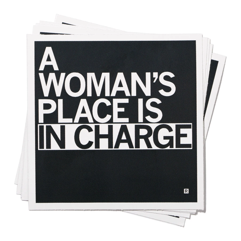 A Woman’s Place Is In Charge. 4″ x 4″ Vinyl sticker. Designed by RAYGUN and printed by Sinclair Graphics in Des Moines, IA.