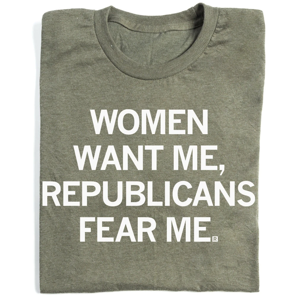 Women Want Me, Republicans Fear Me. A Portion of All RAYGUN Sales Raise Money For Organizations That We Support. White Screen Print on a Military Green T-shirt (50% Polyester / 50% Combed Ringspun Cotton). Cut and sewn sweatshop free. Designed and printed by Union Labor at RAYGUN.