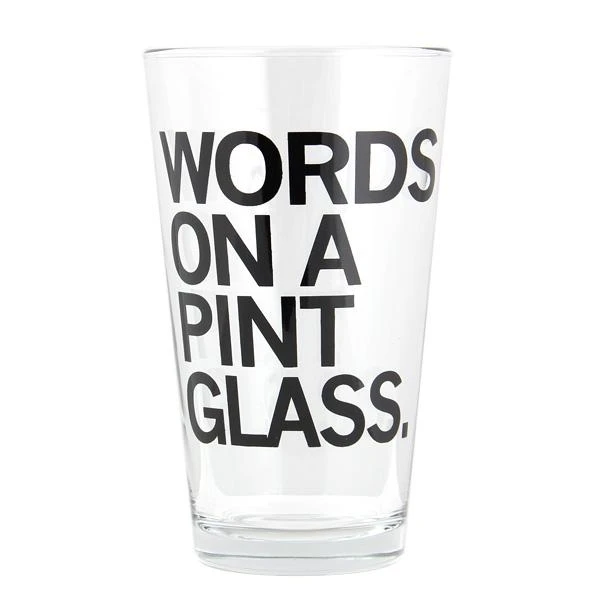 Words On A Pint Glass. Black soy-based ink print on 16 oz. pint glass. Lead free, fade resistant and dishwasher safe. Designed by RAYGUN and Printed by PyroGraphics in Des Moines, IA.