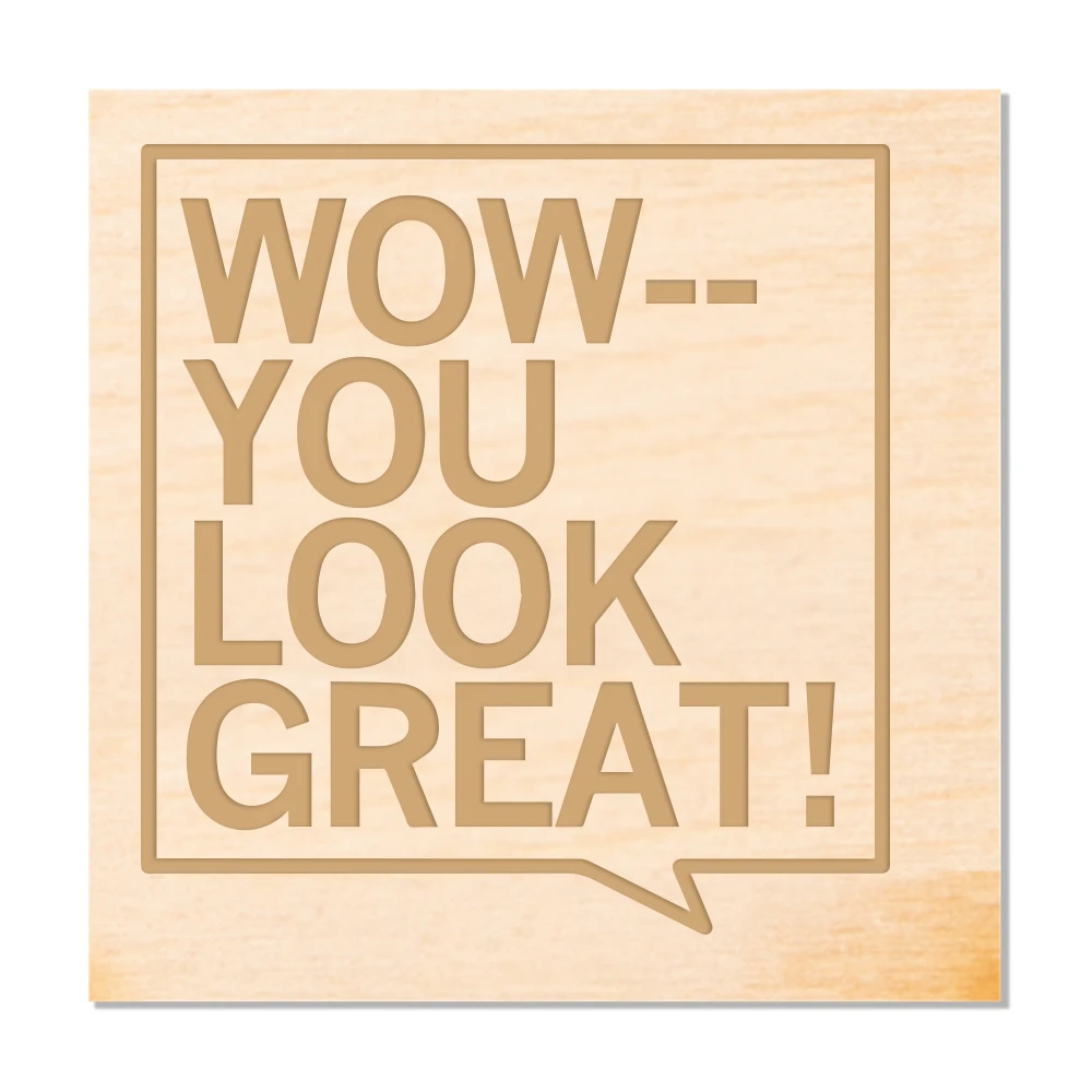 Wow — You Look Great! Black Screen Print. Laser Etch on 1/8 inch Baltic Birch wood. 4×4″ clear sealed and back stained black. Designed by RAYGUN and printed by Union Labor at RAYGUN.