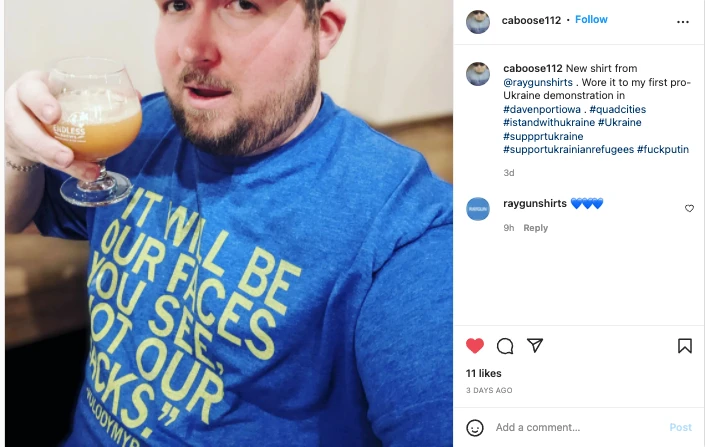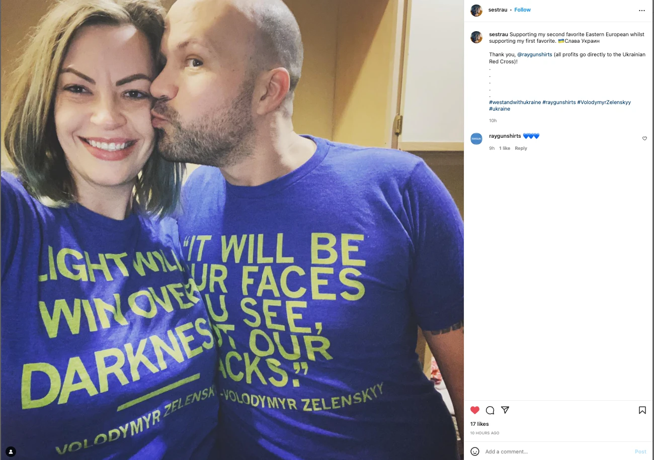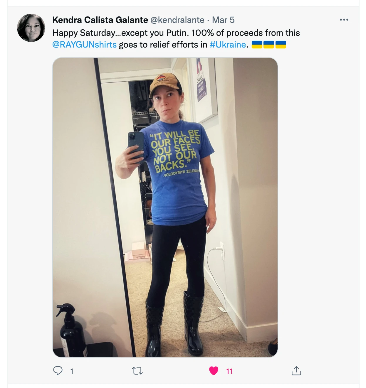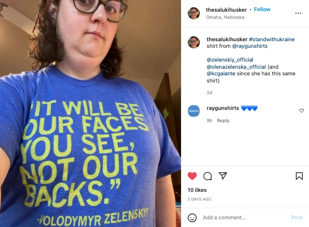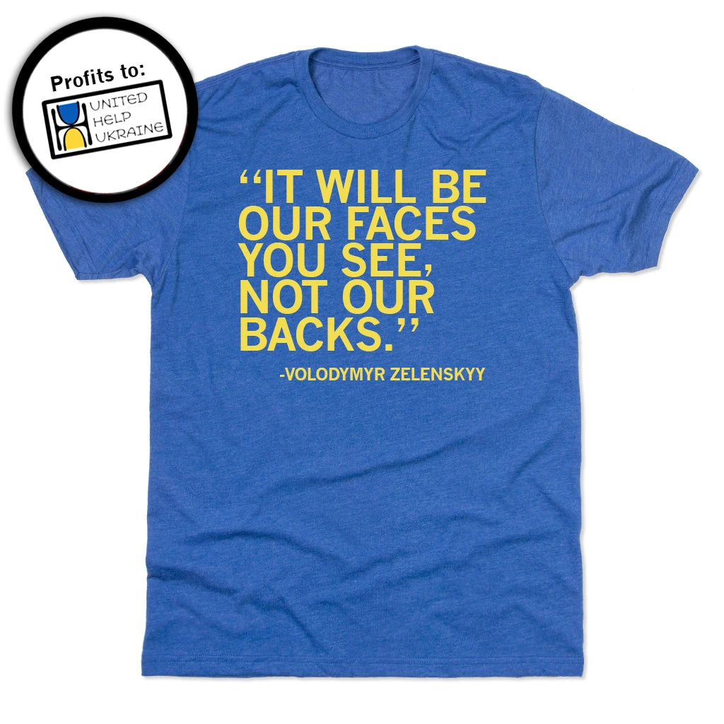 “It will be our faces you see, not our backs.” – Volodymyr Zelenskyy. 100% of the profits will go toward United Help Ukraine. Lemon Screen Print on a Heather Royal Blue T-shirt (50% Combed Ringspun Cotton / 50% Polyester). Cut and sewn sweatshop free. Designed and printed by Union Labor at RAYGUN.